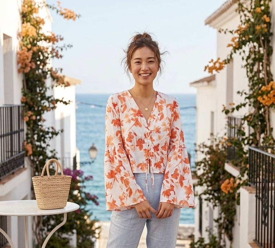 オレンジを基調としたフラワーデザインが印象的で、コーデの主役になる1枚