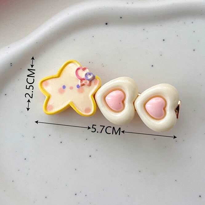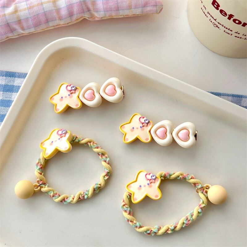 星やハートの形が施されたカラフルなヘアピンとヘアゴムで、おしゃれなスタイルを楽しむことができます
